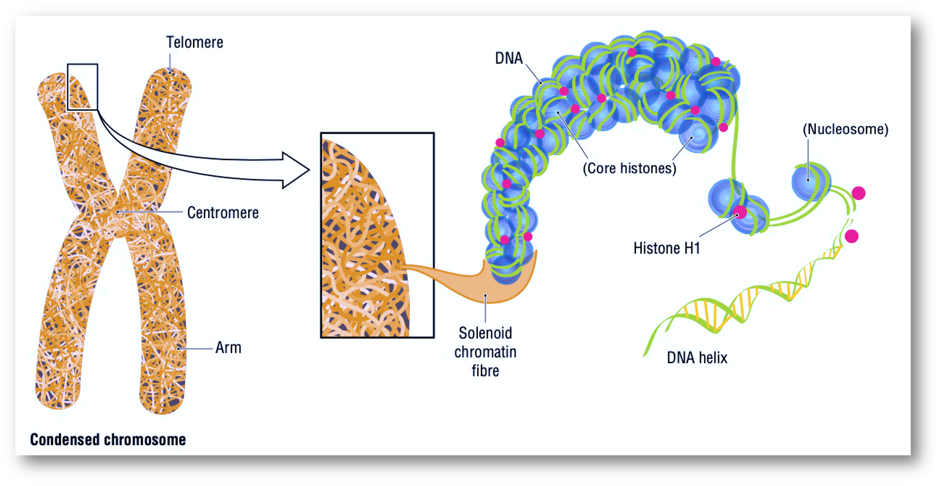 Almost any living organism harbor DNA in a nucleus or chromosome, which is a very compacted structure that could be actually seen to naked eye in some species. It so arranged or condensed Fig. 4.1 that it is the result of multiple compacting strategies.