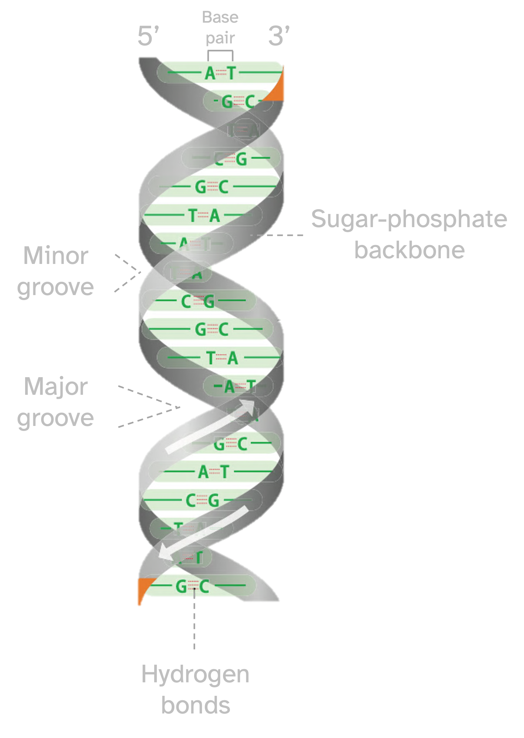 Figure 4.2: DNA double helix structure and main characteristics. Image adapted from Brown (2018) showing the structure with the sugar–phosphate backbone of each polynucleotide drawn as a gray ribbon with the base pairs in green